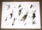 • 17 Henri Michaux, „Ohne Titel“, tachistische Fleckenmalerei. Tintenflecke oder Tuschflecke zeigen eine Suggestion vulkanischen Geschehens als Gesten seelischer Bewegung, die in den Flecken sichtbar werden. Ihr Wesen ist die Bewegung, ihre Erscheinung die Spur. Vorstellungen, bereits vorhandene Bilder, die durch mein Gedächtnis ziehen, werden dadadurch gezwungen unmittelbar zu erscheinen. Es muss  etwas sein, das beim Betrachter sofort etwas erzeugt, das dessen innere Welten anspricht.